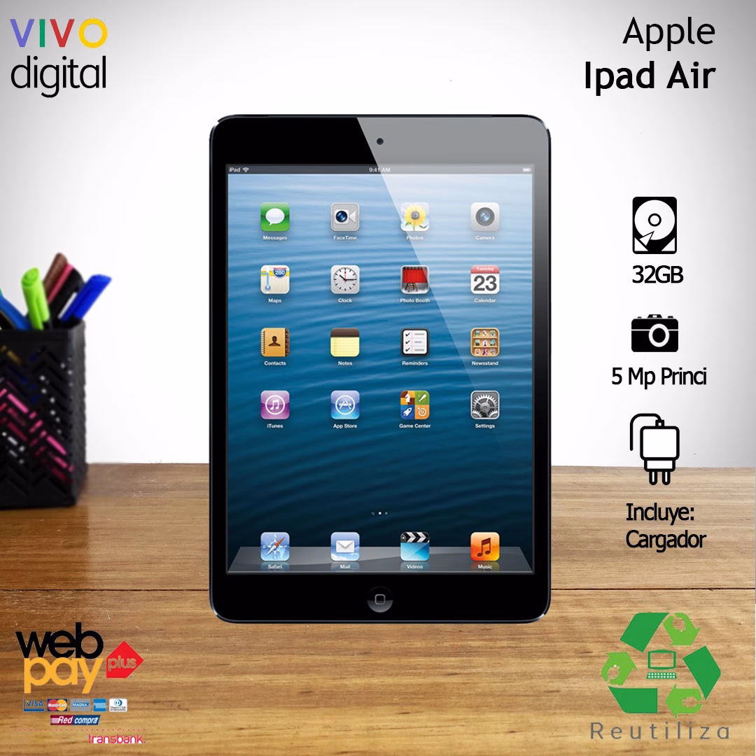 A7 – ARM Cyclone Dual-core (2 Core) 1.30 GHz, 32 GB Storage, iOS 7, Space Gray – Pantalla 9.7″ LED Multi-Touch IPS Retina Display – Puerto 1 x Lightning – Integrated Stereo Speakers 2 x Integrated Microphone 1 x 1/8″ / 3.5 mm Headphone/Microphone – Wi-Fi 4 (802.11n) – Bluetooth 4.0 – Built-In Lithium-PolymerProviding up to 10 Hours per Charge (32.4 Wh) – 5 MP iSight camera; 1080p HD video recording. – Wifi – Incluye Cargador y Cable Lightning.