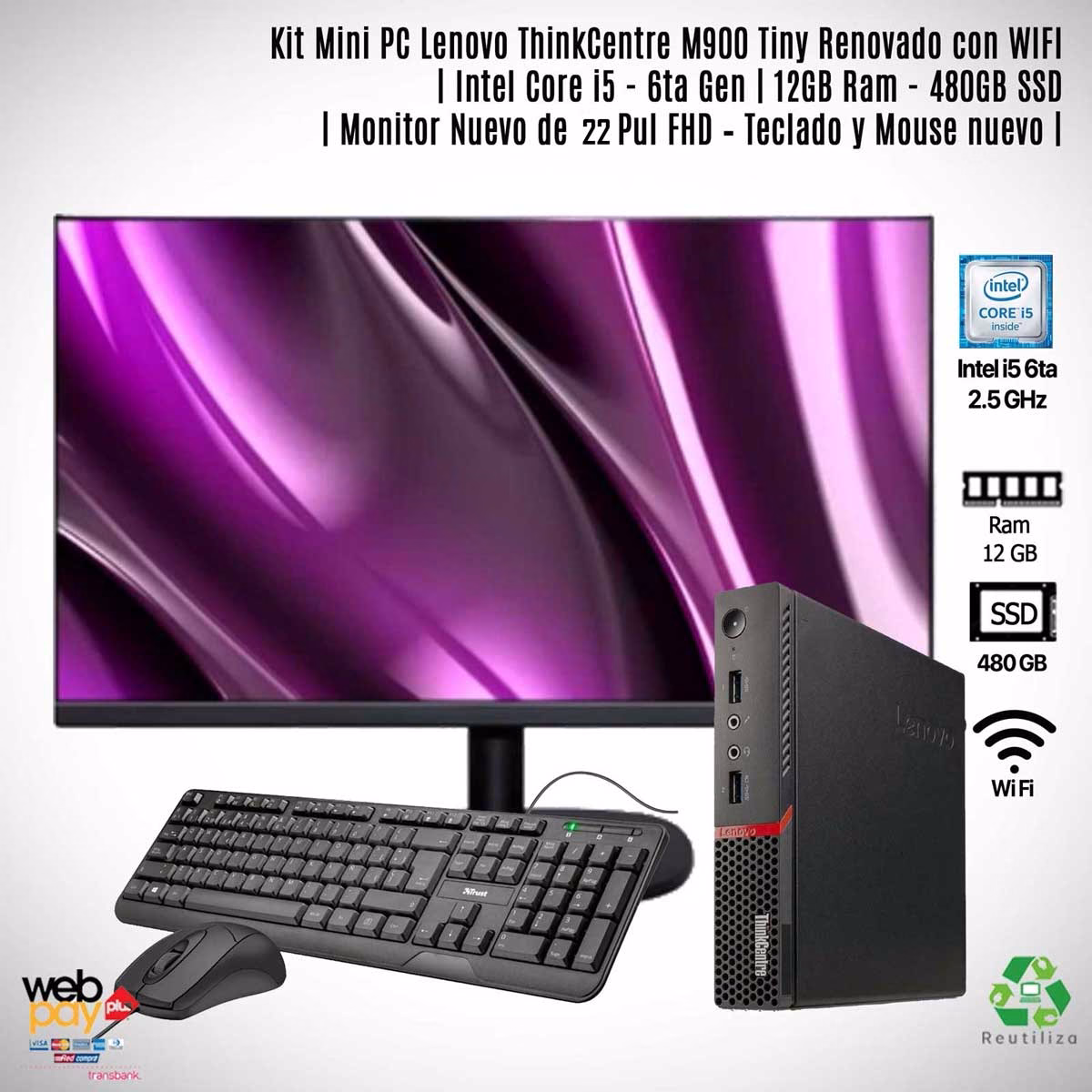 Kit Mini PC Lenovo ThinkCentre M900 Tiny Renovado con WIFI | Intel Core i5 – 6ta Gen | 12GB Ram – 480GB SSD | Monitor Nuevo de 22 Pul FHD – Teclado y Mouse nuevo |