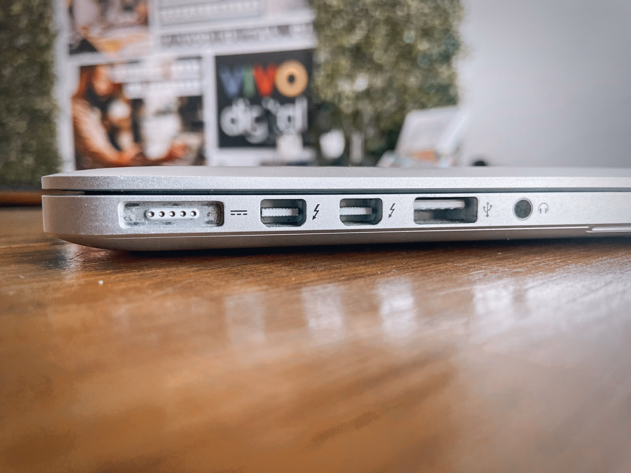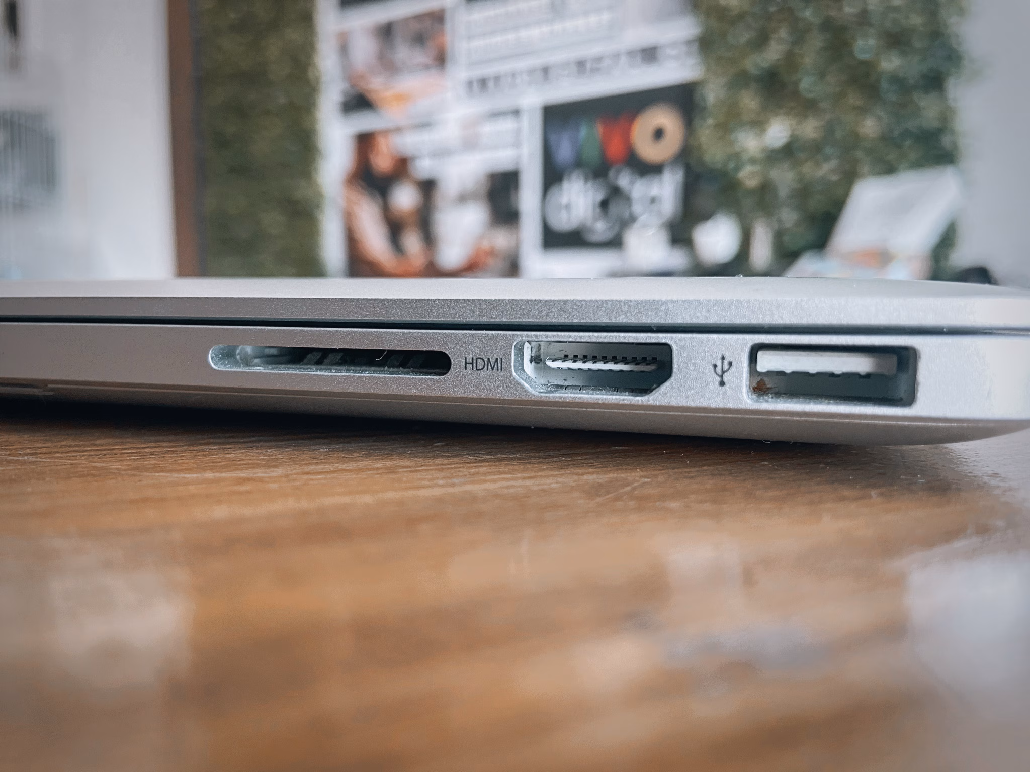 Puerto MagSafe 2 para la toma de corriente, 2 puertos Thunderbolt (compatible con Mini DisplayPort y permite transferencia de datos de alta velocidad), 2 puertos USB 3.0 (hasta 5 Gbps de velocidad de transferencia), 1 Puerto HDMI, 1 Ranura para tarjeta SDXC, Puerto de Audio y Mic, Webcam FaceTime HD 720p, Wi-Fi: Compatible con Wi-Fi 802.11a/b/g/n/ac, lo que permite la conexión a redes inalámbricas de 2,4 GHz y 5 GHz. Bluetooth: Compatible con Bluetooth 4.0, que permite la conexión con dispositivos compatibles, como auriculares, teclados y ratones Bluetooth.