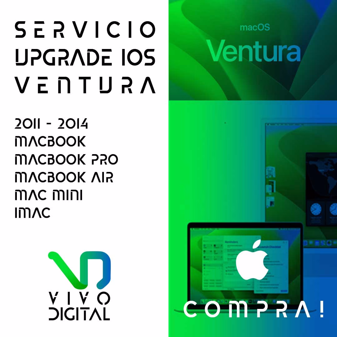 - SERVICIO TECNICO UPGRADE IOS VENTURA A MACBOOK – MACBOOK PRO – MACBOOK AIR – MAC MINI – IMAC – 2011 – 2014 – COMPRA! | SERVICIO PRESENCIAL