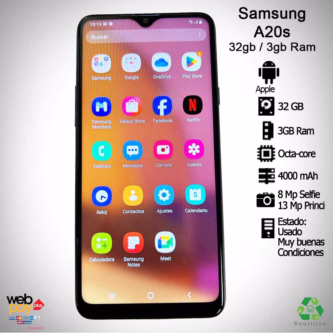 Smartphone Samsung A20s | 32Gb almacenamiento – 3Gb Ram | Procesador Qualcomm | SDM450-B01 Octa-Core – Cámara Frontal 8MP – Cámara Trasera 13MP + 8MP + 5MP | Renovado Muy buenas condiciones